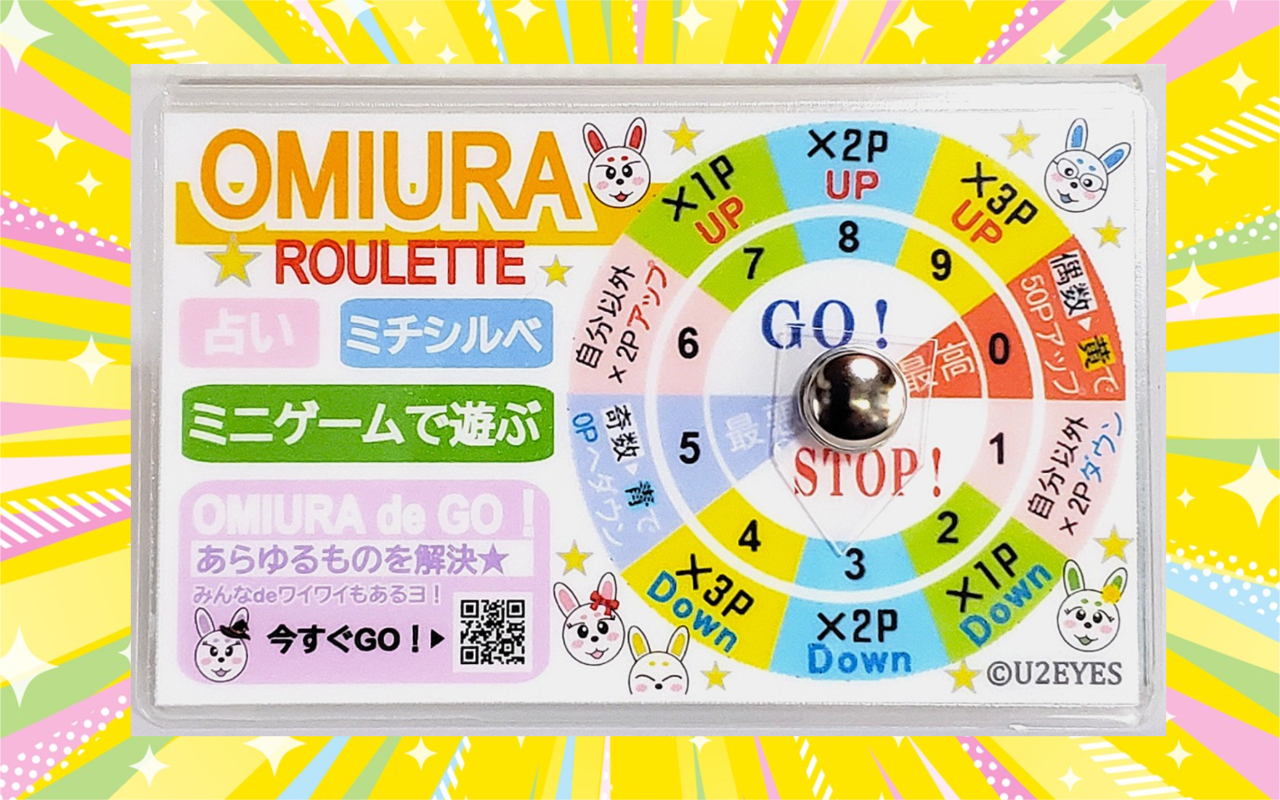 2025年11月28日(金)夜8時30分頃からプレゼント開始決定!『持ち運べる』『占いが出来る』その他に、その場で何かを決めるのに役立つ『ミチシルベ』、みんなdeワイワイ!遊べる『ミニゲーム』も付けてみました。サイズはトレーディングカードくらいのサイズになりますのでどこにでも持って行けるYo(^^)/☆新コンテンツ『OMIURA de GO!』にも対応しています。飲み会・女子会・親睦会…みんなが集まる時はぜひOMIURA(Roulette)を活用してみてね☆